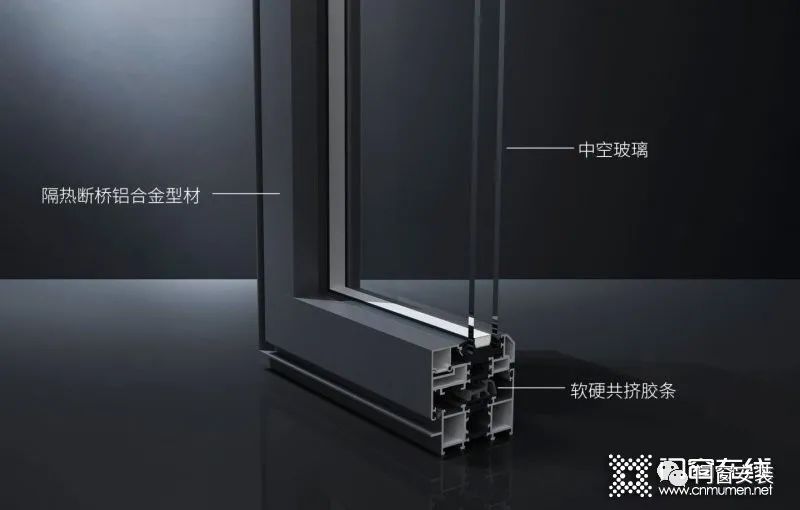 3)软硬共挤的密封胶条。以科玛系列为例,采用软硬共挤的密封胶条,将铝合金型材分为内外两部分阻隔铝的热传导(也就是常说的铝合金多腔密封),型材内外框软性结合增强密闭性,从而起到隔热、保温的效果。