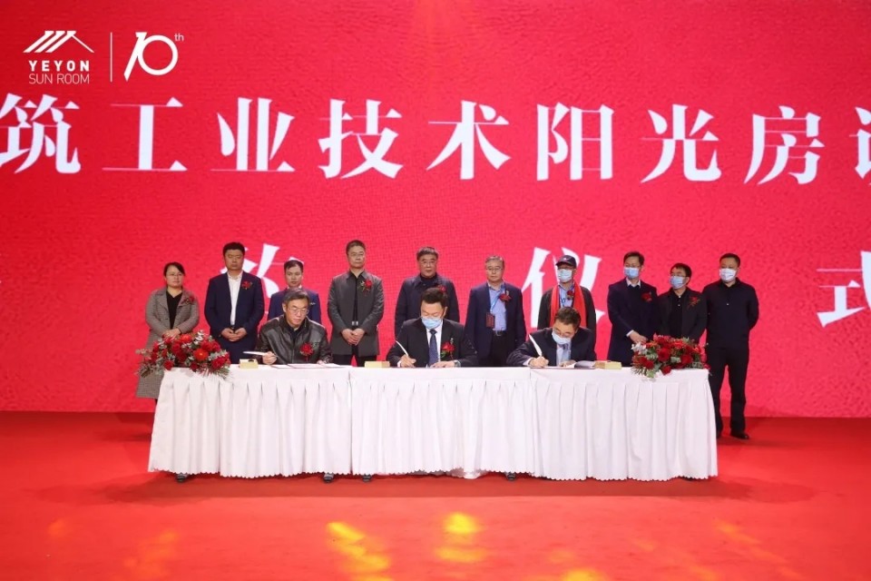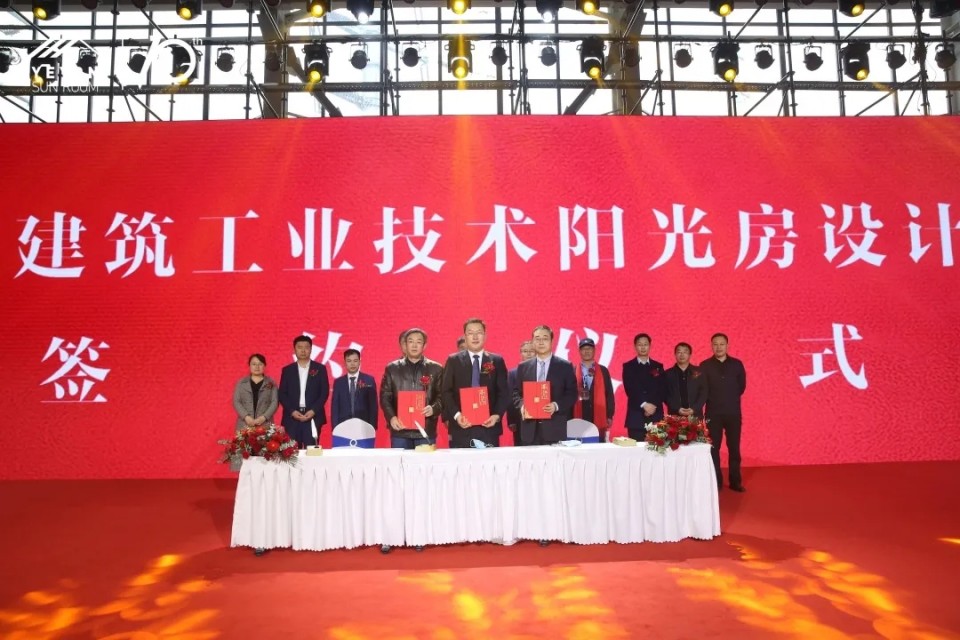 随后,所有参会人员共同见证了阳光房研究院的成立,叶阳阳光房董事长熊诗才先生与受邀嘉宾共同在台上见证阳光房研究院的签约仪式,阳光房设计研究院院长刘子坤先生、国家预制建筑产业委员会秘书长庄晓峰先生、山东建筑大学绿色建筑协同中心常务主任薛一冰先生一同参与了签约。