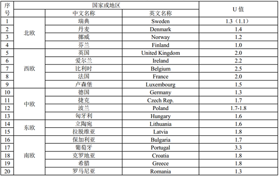 据数据统计,北京市执行门窗传热系数K值低于1.1 W/(m2·K)的要求已经达到了欧洲国家中的领先水平。(见下表)