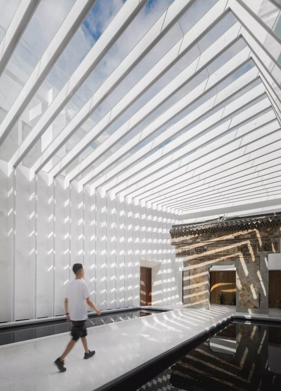 透过屋顶或窗户洒落在墙面、地面,